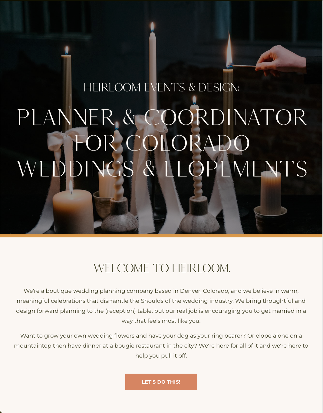 This was a full site copy project, including a completely revamped home page, about page, weddings page, a new elopements page, and a contact page. Heirloom specializes in fun, fresh, colorful, nontraditional weddings and elopements. We created a brand voice that was also fun and fresh, with a grounded, warm undertone to soothe anxieties of couples looking for help.
