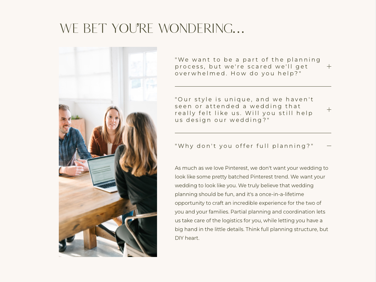 Most couples are told that they can either hire a full, hands on planner who does everything for them, or a day-of coordinator, who shows up at the last minute without understanding the full journey. Heirloom has carved out a magical space for themselves in between, where they can be most helpful to their clients while still honoring the couple’s desire to help plan and design their day. We assuaged their clients’ main pain points (“we want to be involved without doing it ourselves” and “how do we make our wedding feel like us when we haven’t even done this before?”) with honest FAQs and calls to action.