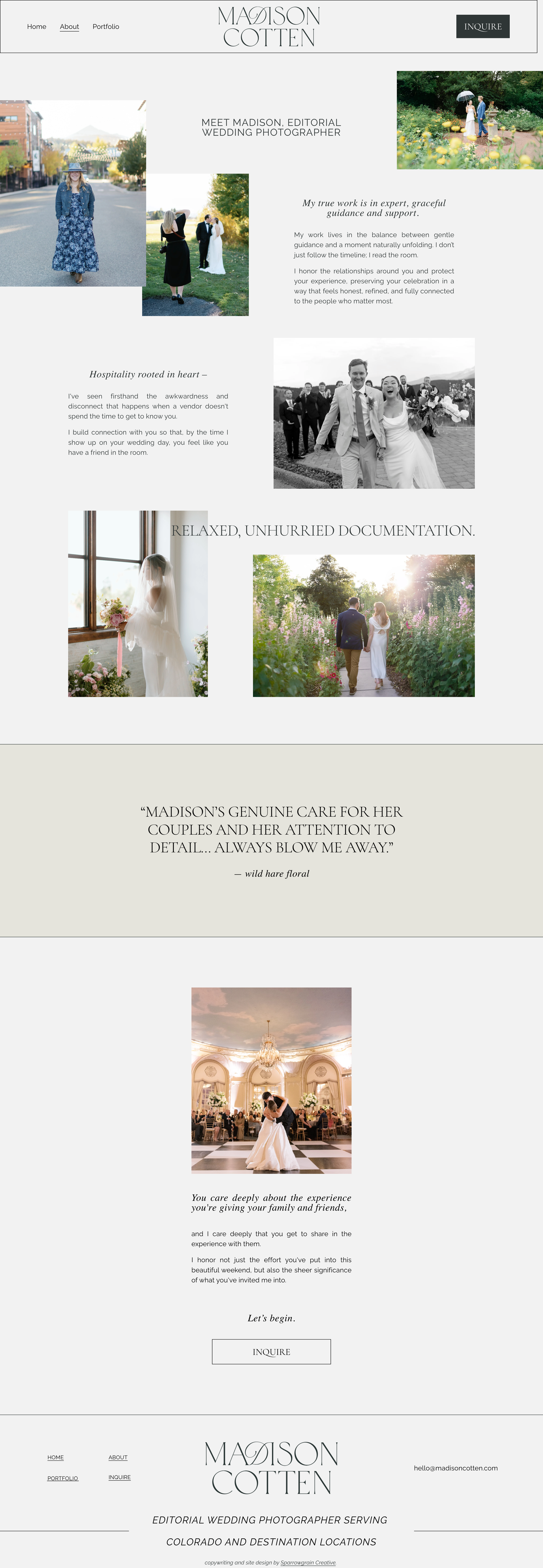 Madison Cotten is a Colorado-based wedding photographer that photographs elegant, traditional, high end weddings. She gets the majority of her leads through planner and vendor referrals and wanted more SEO and AIO optimization for Google and LLM leads. Most importantly, she was looking for a beautiful, minimalist website that matched the elegant tastes of the couples whose weddings she photographs.